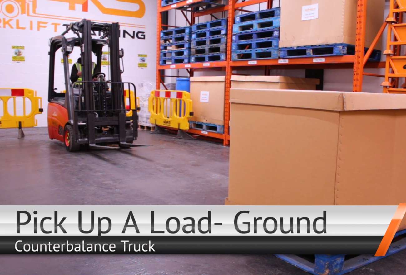 In this forklift training explainer video above, our instructor demonstrates how to safely pick up a load at ground level using the counterbalance forklift truck. This is a common truck for Novice (beginner) counterbalance forklift training.